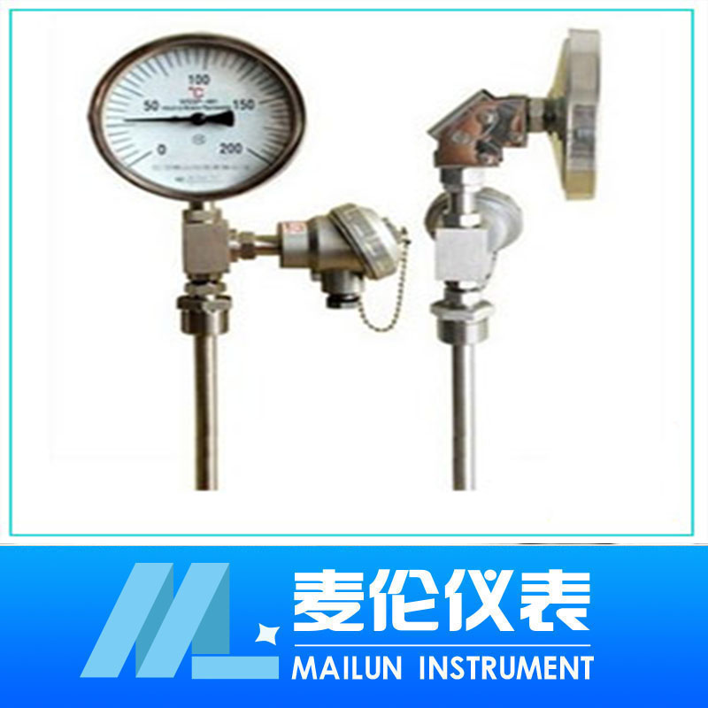 體式雙金屬溫度計與熱電偶/熱電阻一體的方式 采用雙金屬溫度計與熱電偶/熱電阻一體的方式,既滿足現(xiàn)場測溫需求,亦滿足遠距離傳輸需求,可以直接測量各種生產(chǎn)過程中的-80-+500℃范圍內(nèi)液體、蒸氣和氣體介質(zhì)以及固體表面測溫。