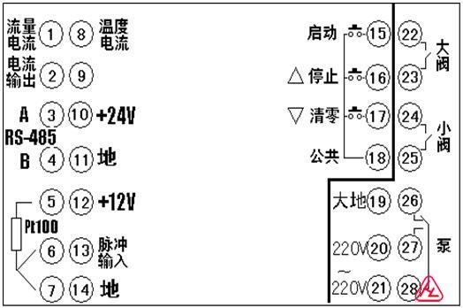 21.220V;22.大閥接點(diǎn)1;23.大閥接點(diǎn)2;24.小閥接點(diǎn)1;25.小閥接點(diǎn)2;26.泵常閉接點(diǎn)27.泵常開觸點(diǎn)28.泵公共觸點(diǎn) |