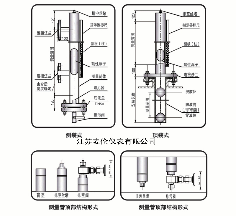 安裝形式;磁翻板液位計有多種安裝形式,以滿足用戶的需要,主要安裝形式有:側(cè)裝、頂裝等。