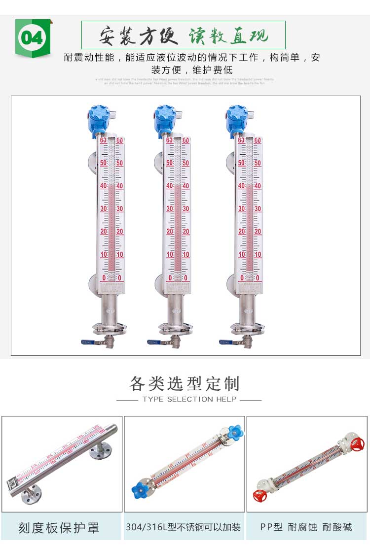 磁翻板液位計的結(jié)構(gòu)。磁翻板液位計的結(jié)構(gòu)關(guān)鍵在于:1個指示器,2個磁懸浮,3個浮桶,IV連接法蘭,IV過濾閥。磁翻板液位計指示器,又稱顯示信息控制面板,是液位儀現(xiàn)場顯示信息和檢測的關(guān)鍵。磁懸浮列車與浮桶中的待測液體直接接觸,并在待測容器中用液位計提升器提升。防腐型磁翻板液位計的磁懸浮也需要外襯PTFE。
