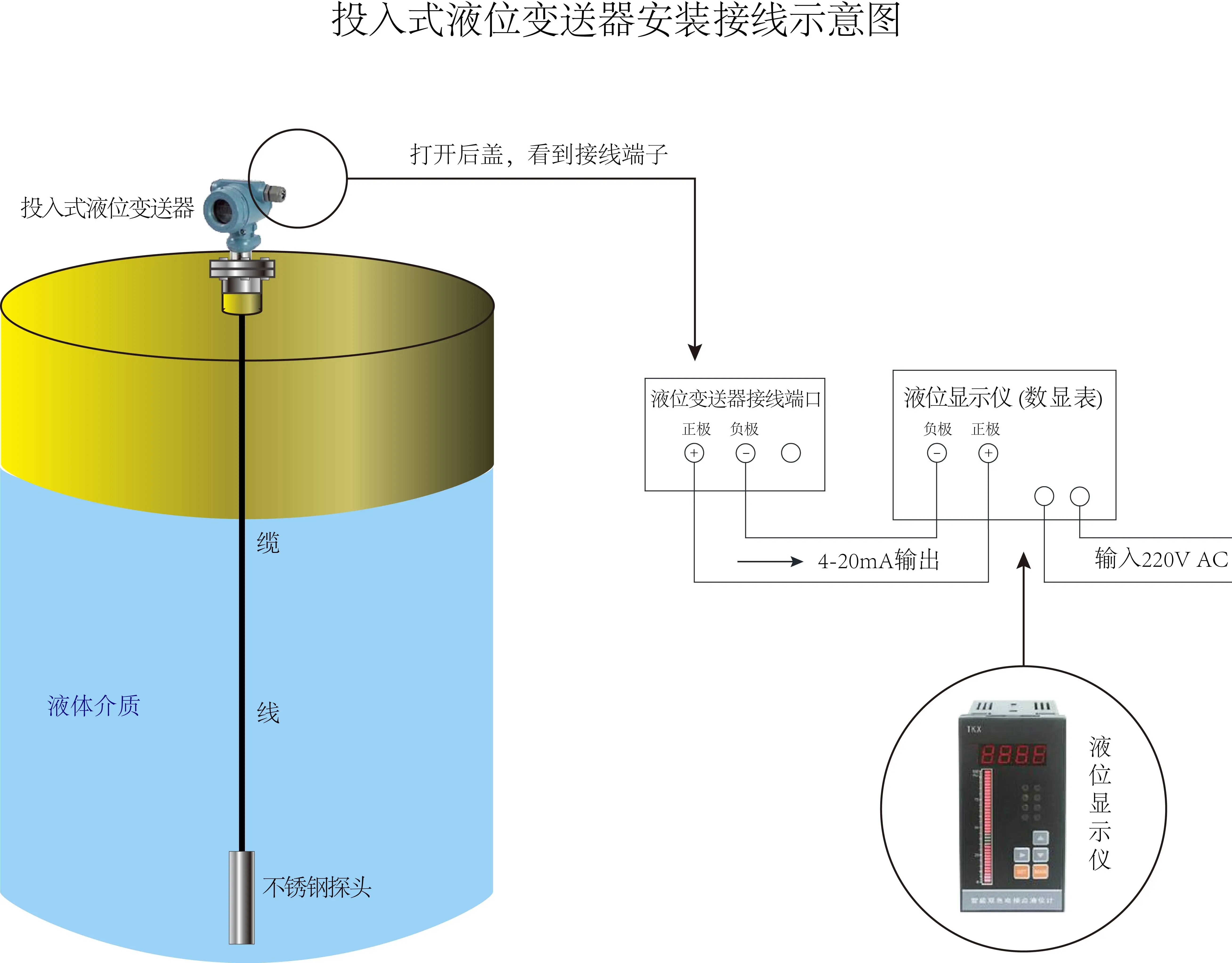 液位傳感器(靜壓式液位計(jì)/液位變送器/液位感應(yīng)器/水位傳感器)是一種測量液位的壓力傳感器。靜壓入式液位變送器(液位計(jì))是基于被測液體靜壓與液體高度成正比的原理。采用國外**的隔離式擴(kuò)散硅傳感器或陶瓷電容式壓敏傳感器,將靜壓轉(zhuǎn)換成電信號,然后通過溫度補(bǔ)償和線性校正,轉(zhuǎn)換成標(biāo)準(zhǔn)電信號(一般為4~20mA/1~5VDC)。