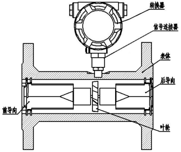 塑料渦輪流量計(jì)主要由表體、前導(dǎo)向、后導(dǎo)向、葉輪、信號(hào)連接器和轉(zhuǎn)換器等組成。
