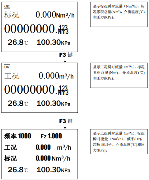2、瞬時流量可切換顯示標況體積流量(Nm3/h)和工況體積流量(m3/h),*多可保留 3 位小數,顯示*大值為 9999999;