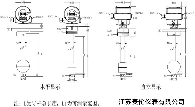 一般來講,標(biāo)準(zhǔn)型浮球液位計(jì)共有四種結(jié)構(gòu)尺寸,如上圖所示。圖中左一和左二為水平顯示,左三和左四為直立顯示。上圖左一型號(hào)的浮球液位計(jì),其過程連接為法蘭連接,導(dǎo)桿尺寸為Φ21*2,表頭距離法蘭為80mm,浮球?yàn)榇笄?。上圖左二型號(hào)浮球液位計(jì),其過程連接為螺紋連接,導(dǎo)桿尺寸為Φ14*1,表頭距離螺紋為20mm,浮球?yàn)樾∏?。上圖左三型號(hào)的浮球液位計(jì),其過程連接為螺紋連接,導(dǎo)桿尺寸為Φ21*2,浮球?yàn)樾∏?,用戶可以從上面看到具體的液位。上圖左四型號(hào)的浮球液位計(jì),其過程連接為法蘭連接,導(dǎo)桿尺寸為Φ14*1,浮球?yàn)榇笄颉?br />