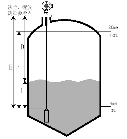 通過(guò)輸入空罐高度E(=零點(diǎn)),滿罐高度F(=滿量程)及一些應(yīng)用參數(shù)來(lái)設(shè)定,應(yīng)用參數(shù)將自動(dòng)使儀表適應(yīng)測(cè)量環(huán)境。對(duì)應(yīng)于4…20mA輸出。